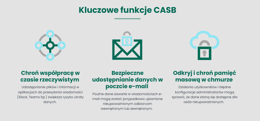 W miarę jak organizacja współpracuje w chmurze, musi ona chronić swoje dane, jednocześnie zapewniając zgodność z przepisami. Potrzebna jest dogłębna wiedza na temat danych i zachowań użytkowników, aby zapewnić dostęp tylko odpowiednim osobom. Organizacja musi być w stanie wykrywać podejrzane działania, takie jak nadmierne próby logowania lub masowe pobieranie plików, niezależnie od urządzeń lub chmury. To samo dotyczy możliwości lokalizowania danych w wielu chmurach i klasyfikowania ich w celu zapobiegania wyciekom.