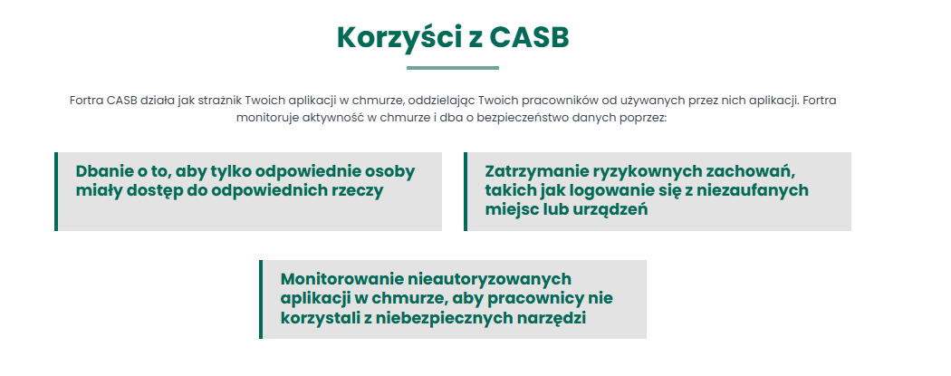 Bezpieczeństwo musi towarzyszyć danym niezależnie od tego, gdzie się znajdują — bez względu na to, kto z nich korzysta, w jaki sposób są wykorzystywane i przez jakie usługi w chmurze przepływają. Fortra CASB to rozwiązanie, które daje pełną kontrolę nad danymi w chmurze. Umożliwia bezpieczne korzystanie z aplikacji i usług SaaS (np. Google Workspace, Microsoft 365), chroni przed wyciekiem informacji i ułatwia spełnianie wymagań związanych z bezpieczeństwem i zgodnością z przepisami.