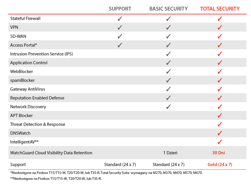 Rozwiązania WatchGuard, zaprojektowane jako inteligentne, szybkie i skuteczne produkty bezpieczeństwa sieciowego zapewniają dogłębną ochronę przed zaawansowanym złośliwym oprogramowaniem, ransomware, botnetami, trojanami, wirusami, programami typu drive-by download, phishingiem i wieloma innymi. Pakiety Total i Basic Security Suite są dostępne dla wszystkich rozwiązań Firebox.